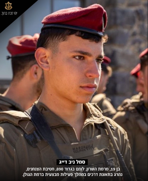 סמל עמית אריה רגב (Amit Arye Regev), בן 19, ממודיעין-מכבים-רעות, לוחם שריון בגדוד 52, עוצבת ׳עקבות הברזל׳ (401), נפל בקרב בצפון רצועת עזה.