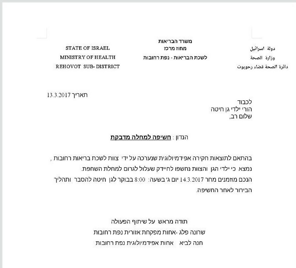 מדובר בקומפלקס ובו 4 גני ילדים בהם נמצאים כ-100 ילדים ומתבצעת פעילות משותפת בשעות הצהריים. ככל הנראה יבדקו ילדי גן חיטה בלבד.