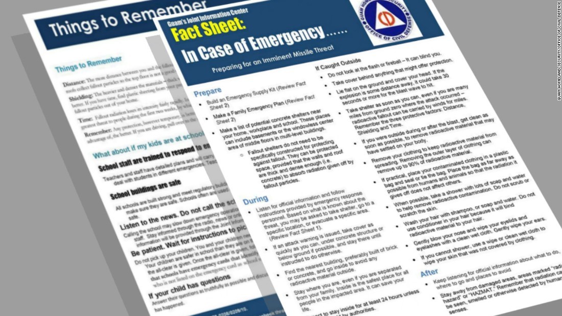בשעות האחרונות מתפרסמות ההנחיות לתושבי גואם כיצד לנהוג במקרה של נפילת טילים, בין ההנחיות הוא הצורך להכין תיק חירום, לדעת היכן המקלט המקום הממוגן הקרוב ביותר, לא להסתכל על כדור האש או ההבזק של הטיל.