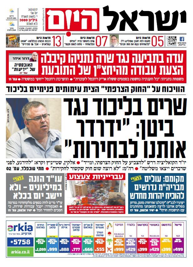 כותרות עיתונים 30/10/2017 - ישראל היום /ידיעות אחרונות