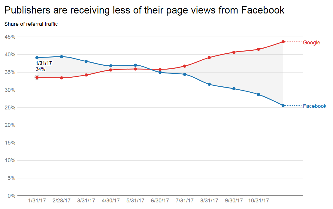 זה בעצם היפוך מתחילת השנה: בחודש ינואר פייסבוק סיפקה כמעט 40 אחוזים של תנועה ועכשיו זה ירד ל26 אחוזים. גוגל שהחלה את השנה ב-34% מייצרת כיום 44% מהתנועה. הנתונים של Parse.ly מגיעים מכ- 2500 בעלי אתרים המשתמשים בשירות הניתוח שלה, כולל וול סטריט ג'ורנל, טיים, והפינגטון פוסט.