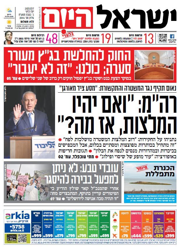 שער עיתון ישראל היום – 20.12.2017