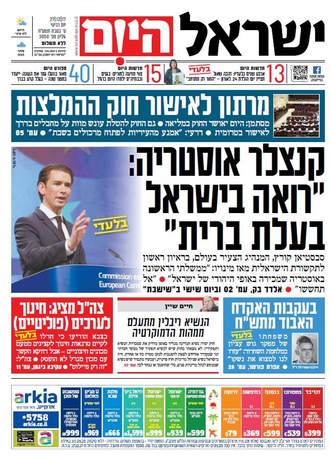 כותרות עיתונים 27/12/2017 - ישראל היום /ידיעות אחרונות
