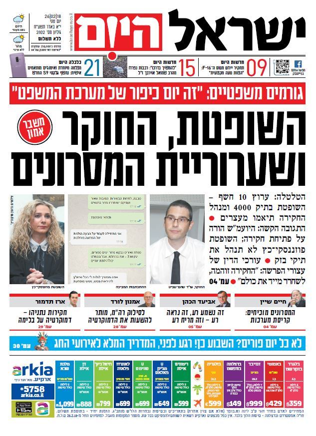 כותרות עיתונים 26/02/2018 - ישראל היום /ידיעות אחרונות