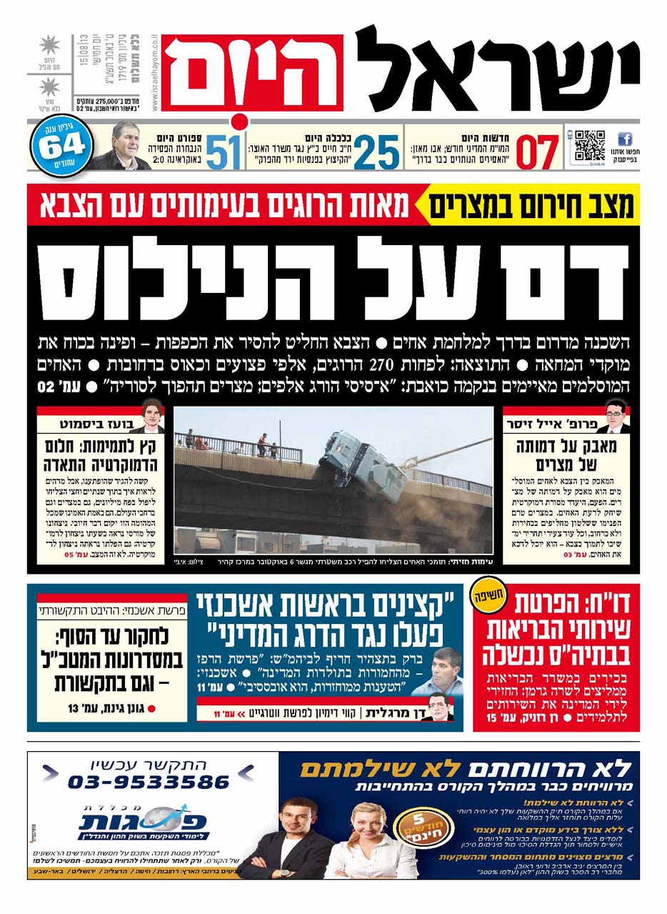 כותרות עיתונים - 15/08/13 - ישראל היום