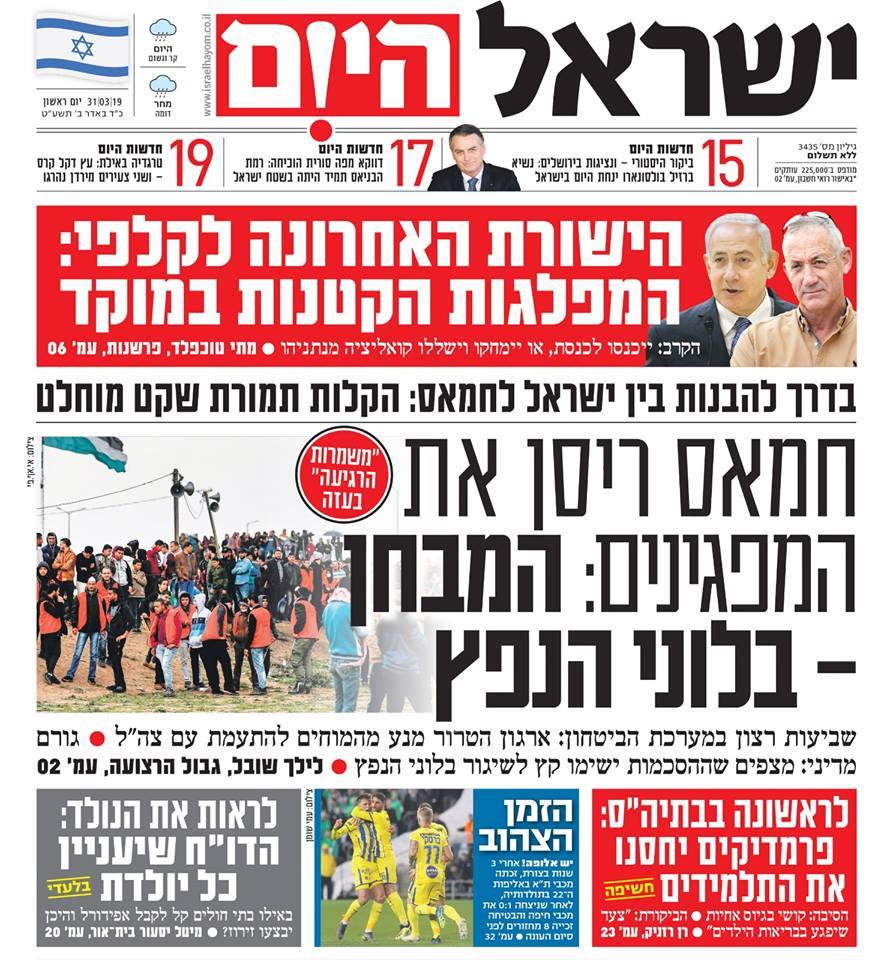 כותרות עיתונים 31/03/2019 - ישראל היום /ידיעות אחרונות