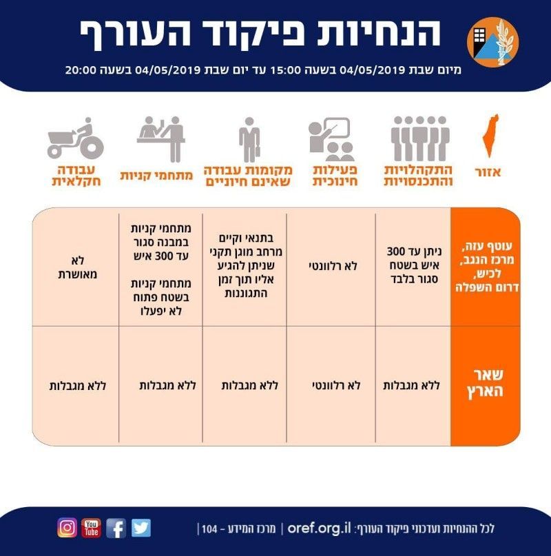 הלן הנחיות פיקוד העורף לאזורים עוטף עזה, לכיש, מרכז הנגב ודרום השפלה מיום שבת 4/5/2019 החל מהשעה 10:00 ועד ליום שבת 4/5/2019 בשעה 20:00: