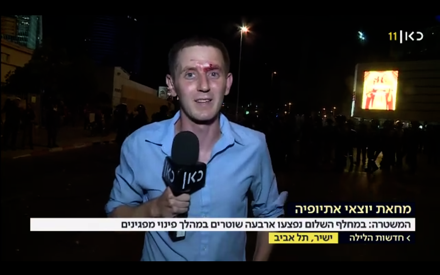 נראה שהוא לא מודע לפגיעה וחושב שמדובר בפגיעה קלה בלבד ועדיין ממשיך לשדר. גם הצלם נפגע באירוע מאבן שנזרקה על השוטרים