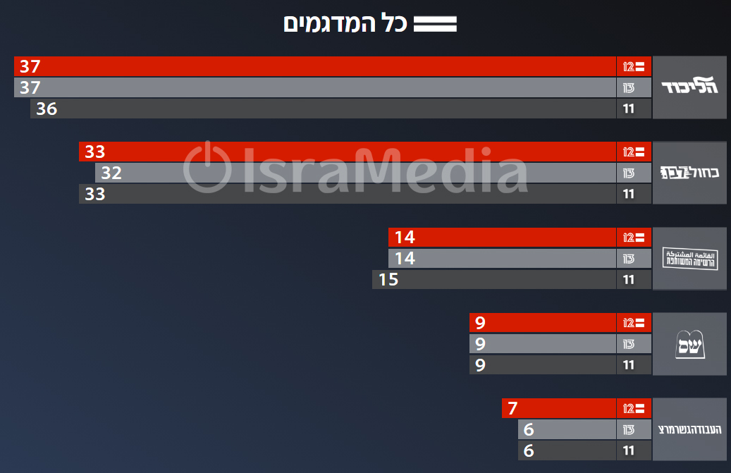 הליכוד - 37 כחול לבן - 33 הרשימה המשותפת - 14 שס - 9 העבודהגשרמרצ - 7 ימינה - 7 ש"ס - 9 יהדות התורה - 7 ישראל ביתנו - 6 חלוקה לגושים: גוש ימין-חרדים: 60 גוש מרכז-שמאל: 54 ליברמן: 6