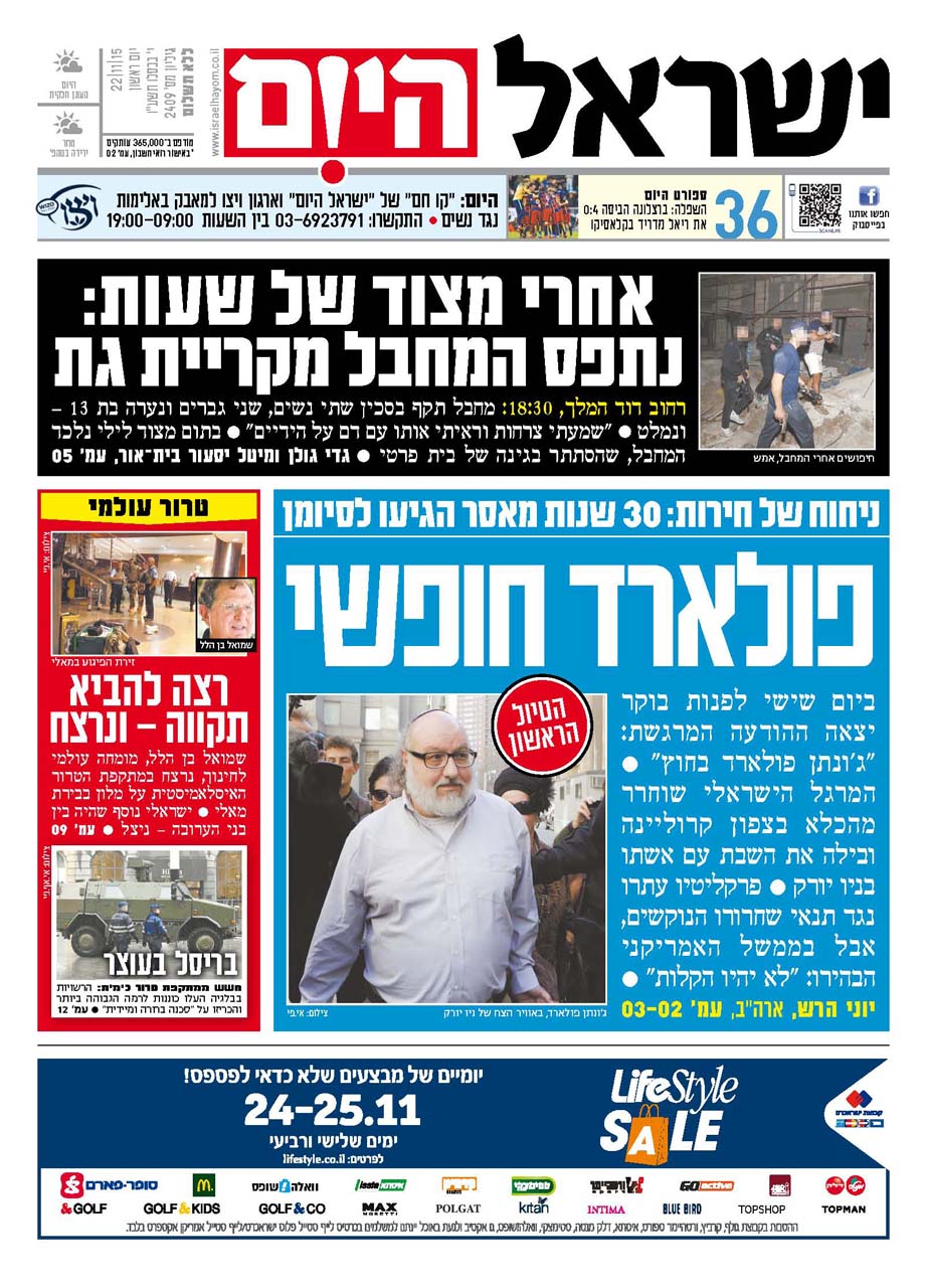 כותרות עיתונים 22/11/2015 - ישראל היום / ידיעות אחרונות