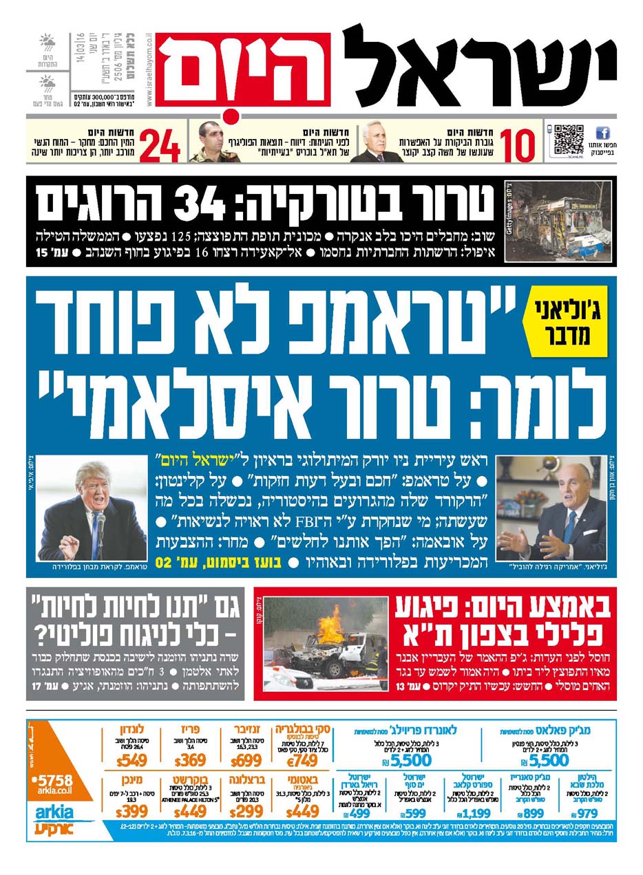 שער עיתון ישראל היום 14.03.2016