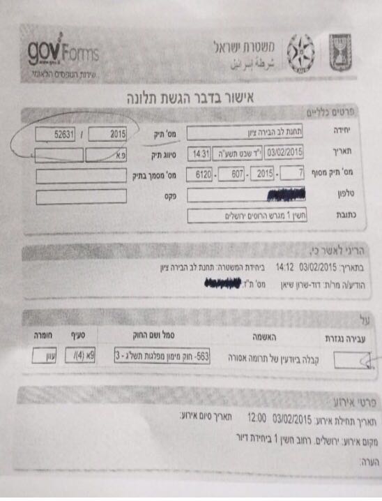 אישור בדבר הגשת תלונה על חוק מימון המפלגות שהגיש מר דוד שיאן יו"ר צעירי הליכוד בתאריך 3.2.15
