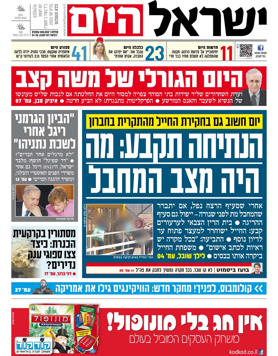 כותרות עיתונים 03/04/2016 - ישראל היום / ידיעות אחרונות