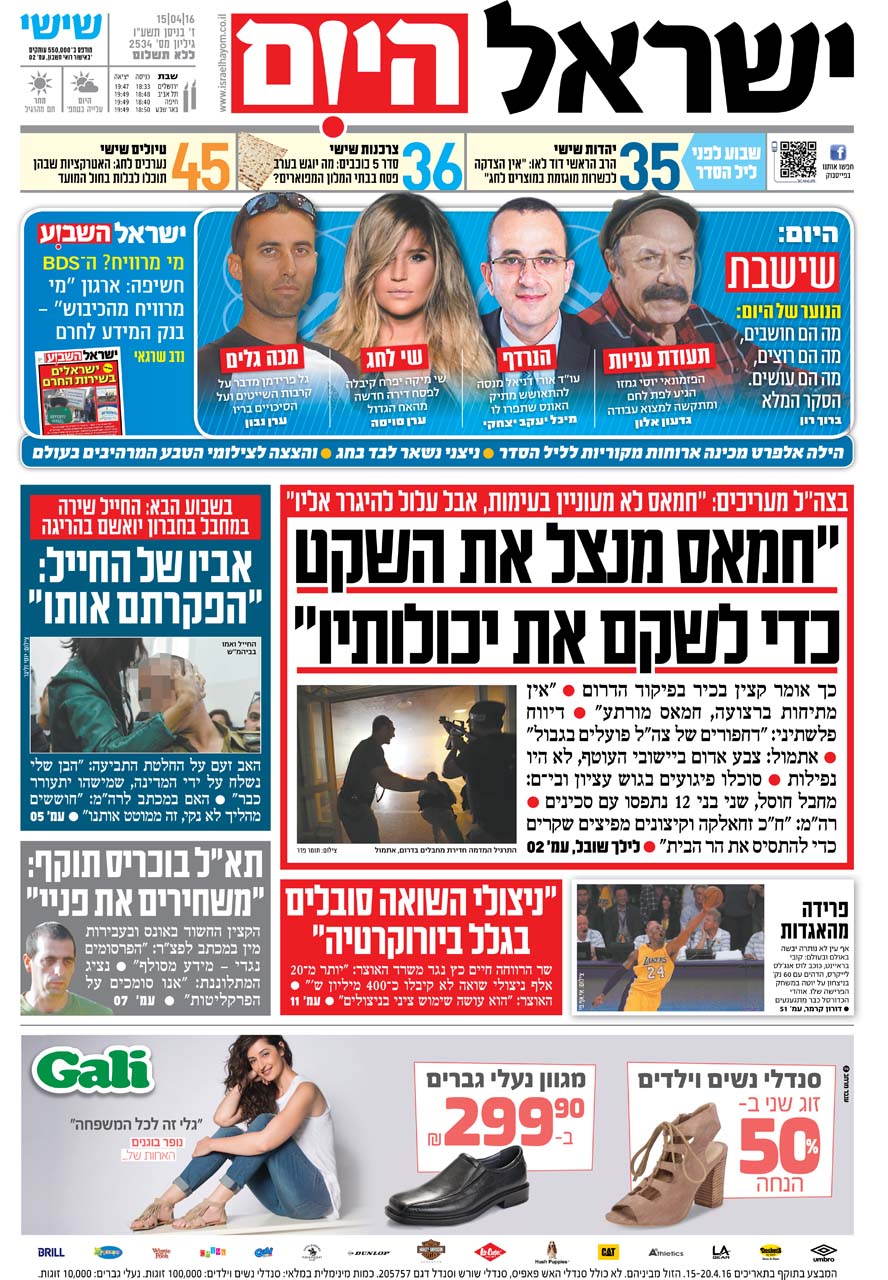 כותרות עיתונים 15/04/2016 - ישראל היום / ידיעות אחרונות
