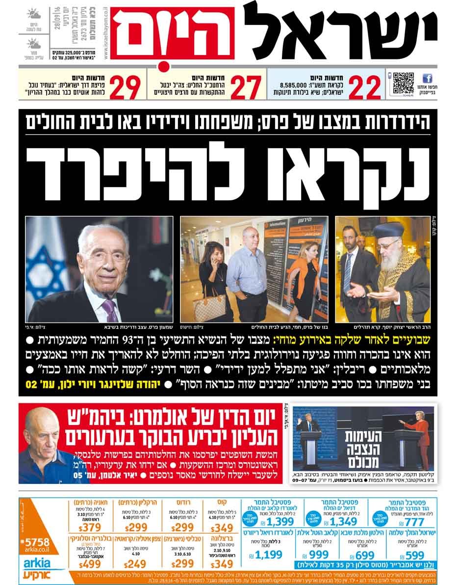 כותרות עיתונים 28/09/2016 - ישראל היום / ידיעות אחרונות
