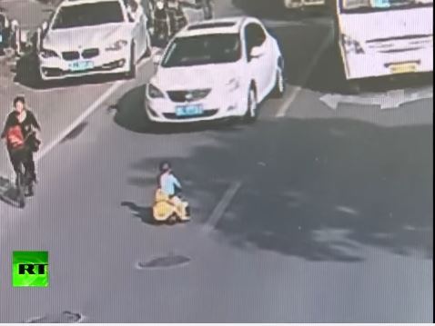 במצלמות האבטחה בסין נקלט ילד קטן בן 3 נוסע על אופניים (נראה כמו בימבה משופרת) באמצע כביש סואן ונגד כיוון התנועה. איש מהנהגים לא עצר ולו לרגע לקחת את הילד שנמצא בסכנת חיים באמצע הכביש. למרבה המזל שוטר תנועה שעבר שם הוציא את הילד מהכביש והחזיר אותו לאמו.