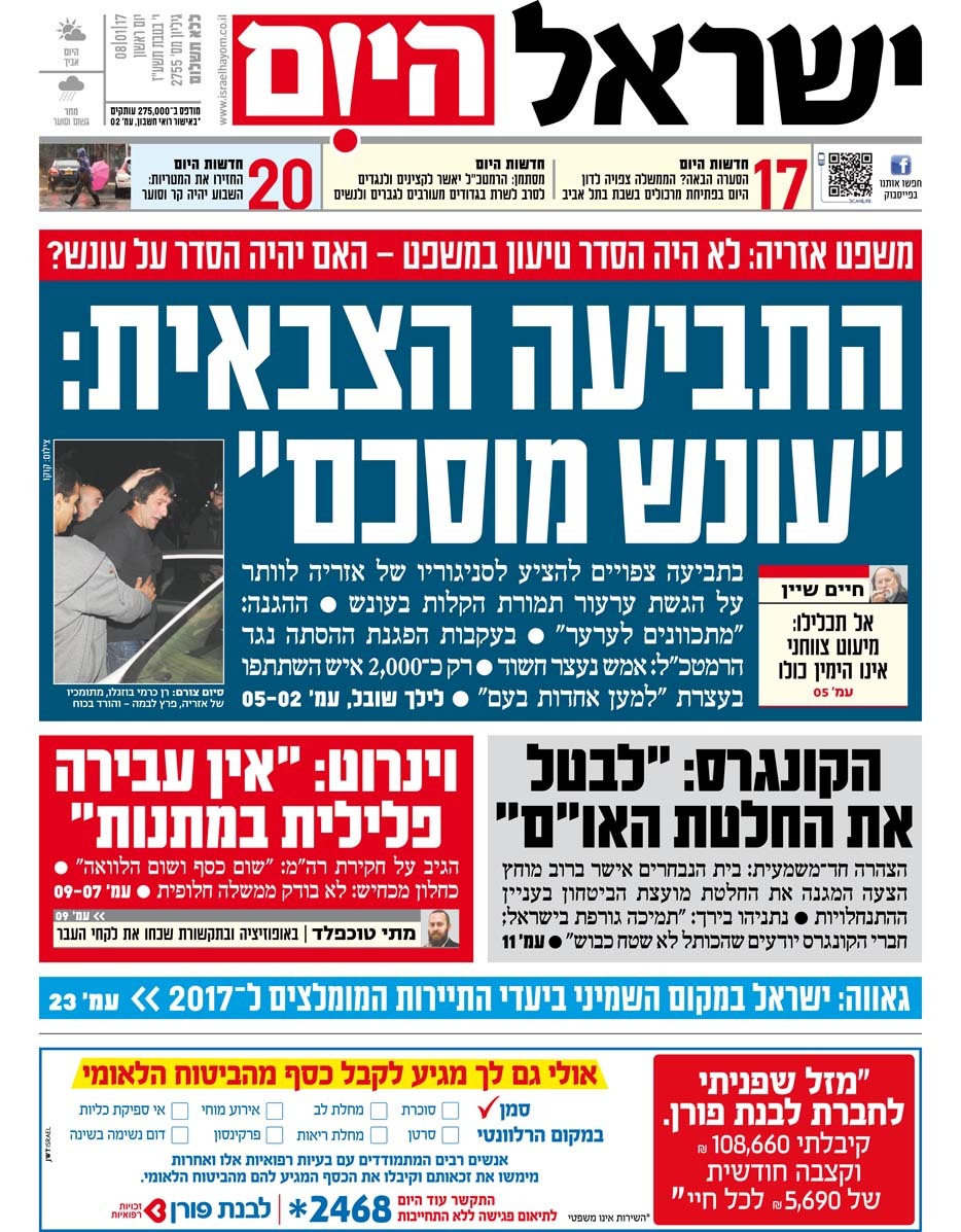 כותרות עיתונים 08/01/2017 - ישראל היום / ידיעות אחרונות
