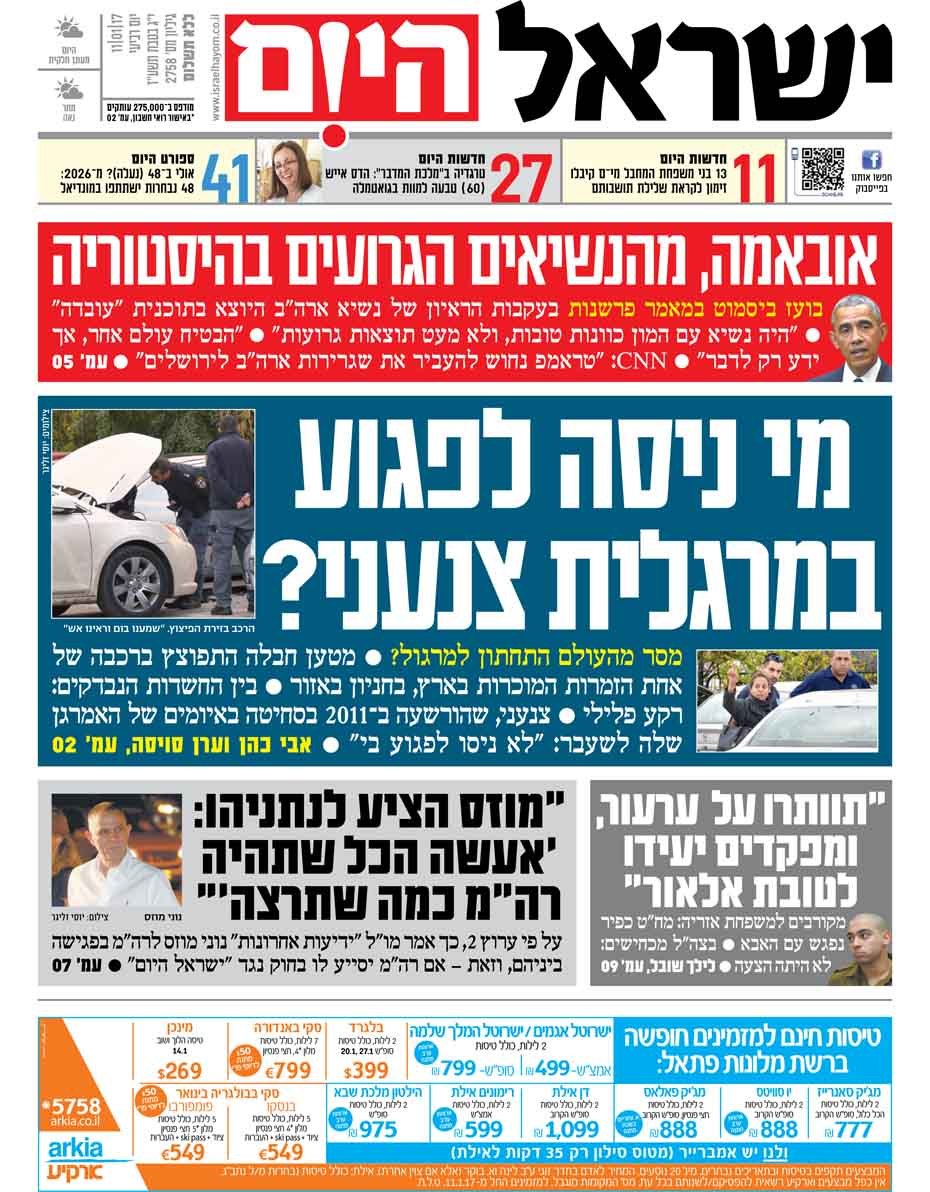 • כותרות עיתונים 11/01/2017 - ישראל היום תמונה מצורפת וידאו מצורף
