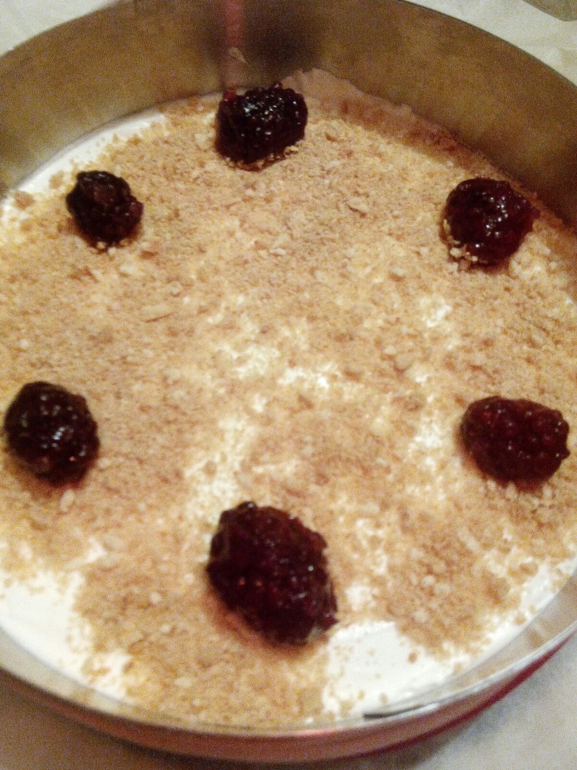 לאחר מכן יוצקים בעדינות מתערובת הגבינות והקצפת על הפירורים שבתבנית ומשטחים בעדינות עד ליישור החלק העליון.