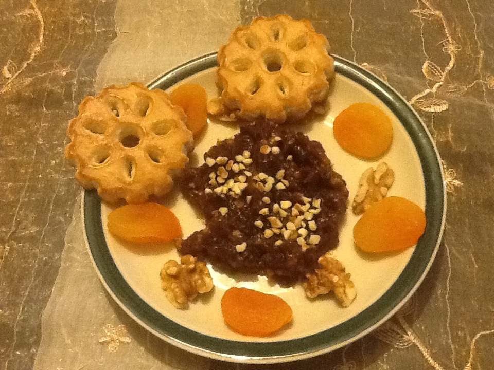 בתמונה: חרוסת כשרה לפסח המכילה - תמרים, אגוזי מלך טחונים עבה, שקדים טחונים עבה, פלח של מלון מגורד דק