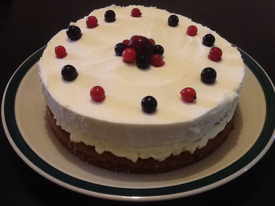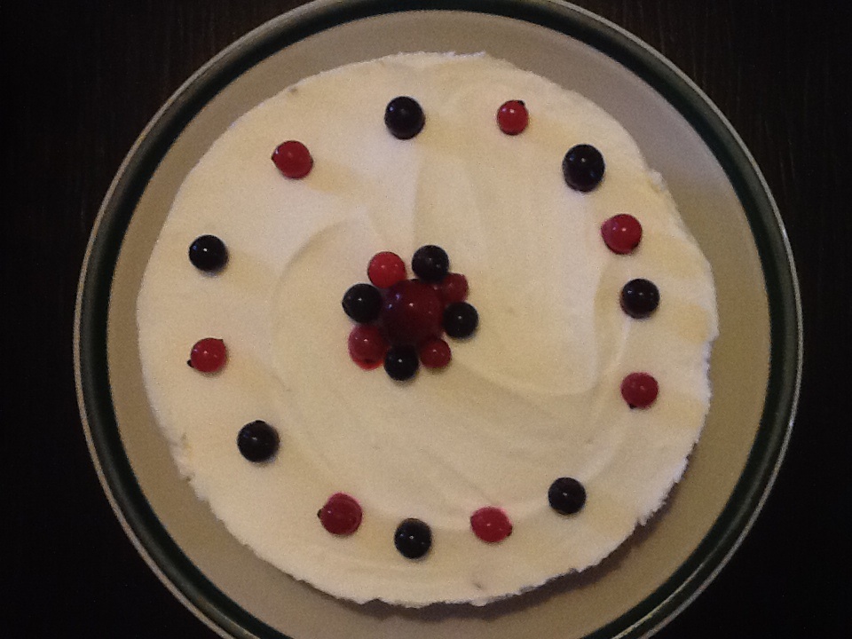 להכניס למקפיא לפחות לשעה, להניח על העוגה פירות יער או דובדבנים.