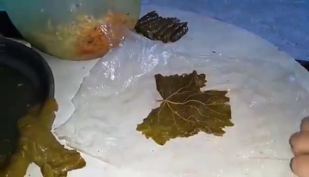 להניח את העלה על ניילון עבה כמו נייר צלופן, למלא במעט מין המילוי ולגלגל קודם מהצדדים פנימה ולאחר מכן מלמעלה עד שמתקבלת צורת הסיגר האופיינית לעל הגפן.